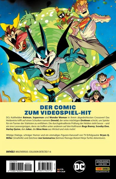 DER COMIC ZUM VIDEOSPIEL-HIT DCs Kulthelden Batman, Superman und Wonder Woman in ihrem abgedrehtesten Crossover! Das Heldentrio trifft auf einen Schurken namens Devoid, der seine mächtigen Drohnen schickt, um Spieler für ein Turnier der Stärksten zu entführen. Die durchgeknallteste Prüfung der Helden steht bevor - und ein irres Lesevergnügen, denn sie treffen unter anderem auf den Kulthasen Bugs Bunny, Scooby-Doo, Harley Quinn, den Joker, die Böse Hexe aus Wicked und viele mehr! Witzige Dialoge, schräger Humor und ein einmaliges Figuren-Karussell von TV-Erfolgsautor Bryan Q. Miller (Smallville) und Zeichner Jon Sommariva (Batman/Teenage Mutant Ninja Turtles Adventures). ENTHÄLT: MULTIVERSUS: COLLISION DETECTED 1-6