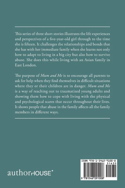 This series of three short stories illustrates the life experiences and perspectives of a five-year-old girl through to the time she is fifteen. It challenges the relationships and bonds that she has with her immediate family when she learns not only how to adapt to living in a big city but also how to survive abuse. She does this while living with an Asian family in East London. The purpose of Mum and Me is to encourage all parents to ask for help when they find themselves in difficult situations where they or their children are in danger. Mum and Me is a way of reaching out to traumatized young adults and showing them how to cope with living with the physical and psychological scares that occur throughout their lives. It shows people that abuse in the family affects all the family members in different ways.