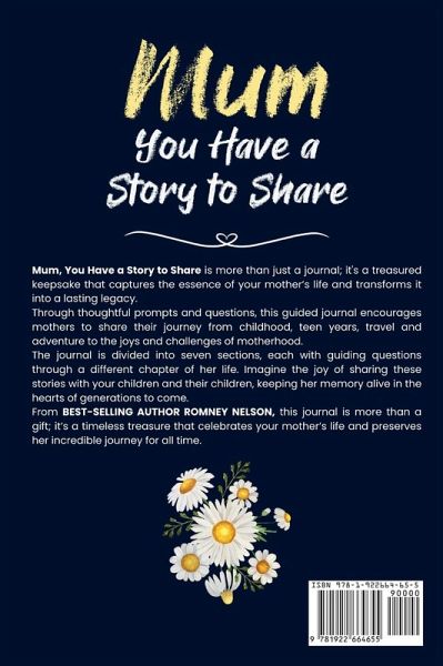 Mum, You Have a Story to Share is more than just a journal; it's a treasured keepsake that captures the essence of your mother's life and transforms it into a lasting legacy. Through thoughtful prompts and questions, this guided journal encourages mothers to share their journey from childhood, teen years, travel and adventure to the joys and challenges of motherhood. The journal is divided into seven sections, each with guiding questions through a different chapter of her life. Imagine the joy of sharing these stories with your children and their children, keeping her memory alive in the hearts of generations to come. With over 200 thought-provoking questions and prompts, Mum, You Have a Story to Tell is a cherished and enjoyable way to inspire your Mum to share and preserve her life story. Features & Benefits:200+ Guided Prompts: Carefully selected questions gently guide your Mum through her memories, making it easy and enjoyable for her to reflect, write, and share the stories of her life. Perfectly Sized: With 80+ elegantly designed pages, the 7x10 inch journal is crafted for ease of use and portability, ensuring your Mum can carry it anywhere. Available in both paperback and hardcover options. Beautifully Crafted for Your Mum: This thoughtfully designed guided journal invites your Mum to explore and celebrate her life's journey. Each page is an opportunity to capture the essence of her incredible story. From BEST-SELLING AUTHOR ROMNEY NELSON, this journal is more than a gift; it's a timeless treasure that celebrates your mother's life and preserves her incredible journey for all time.