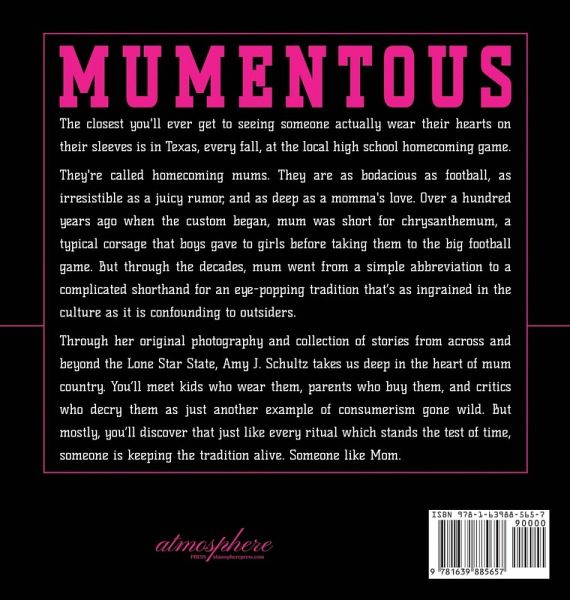 The closest you'll ever get to seeing someone actually wear their hearts on their sleeves is in Texas, every fall, at the local high school homecoming game. They're called homecoming mums. They are as bodacious as football, as irresistible as a juicy rumor, and as deep as a momma's love. Over a hundred years ago when the custom began, mum was short for chrysanthemum, a typical corsage that boys gave to girls before taking them to the big football game. But through the decades, mum went from a simple abbreviation to a complicated shorthand for an eye-popping tradition that's as ingrained in the culture as it is confounding to outsiders. Through her original photography and collection of stories from across and beyond the Lone Star State, Amy J. Schultz takes us deep in the heart of mum country. You'll meet kids who wear them, parents who buy them, and critics who decry them as just another example of consumerism gone wild. But mostly, you'll discover that just like every ritual which stands the test of time, someone is keeping the tradition alive. Someone like Mom.