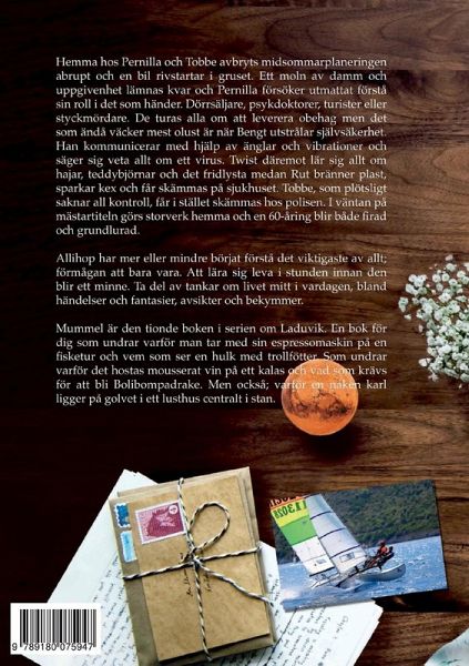 Hemma hos Pernilla och Tobbe avbryts midsommarplaneringen abrupt och en bil rivstartar i gruset. Ett moln av damm och uppgivenhet lämnas kvar och Pernilla försöker utmattat förstå sin roll i det som händer. Dörrsäljare, psykdoktorer, turister eller styckmördare. De turas alla om att leverera obehag men det som ändå väcker mest olust är när Bengt utstrålar självsäkerhet. Han kommunicerar med hjälp av änglar och vibrationer och säger sig veta allt om ett virus. Twist däremot lär sig allt om hajar, teddybjörnar och det fridlysta medan Rut bränner plast, sparkar kex och får skämmas på sjukhuset. Tobbe, som plötsligt saknar all kontroll, får i stället skämmas hos polisen. I väntan på mästartiteln görs storverk hemma och en 60-åring blir både firad och grundlurad. Allihop har mer eller mindre börjat förstå det viktigaste av allt; förmågan att bara vara. Att lära sig leva i stunden innan den blir ett minne. Ta del av tankar om livet mitt i vardagen, bland händelser och fantasier, avsikter och bekymmer. Mummel är den tionde boken i serien om Laduvik. En bok för dig som undrar varför man tar med sin espressomaskin på en fisketur och vem som ser en hulk med trollfötter. Som undrar varför det hostas mousserat vin på ett kalas och vad som krävs för att bli Bolibompadrake. Men också; varför en naken karl ligger på golvet i ett lusthus centralt i stan.
