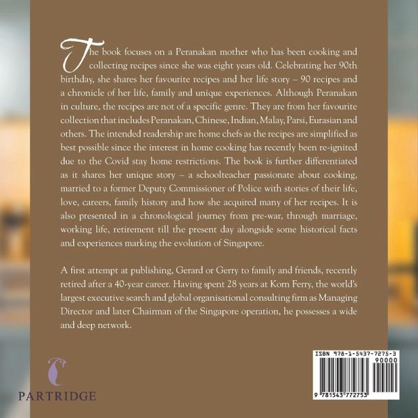 The book focuses on a Peranakan mother who has been cooking and collecting recipes since she was eight years old. Celebrating her 90th birthday, she shares her favourite recipes and her life story - 90 recipes and a chronicle of her life, family and unique experiences. Although Peranakan in culture, the recipes are not of a specific genre. They are from her favourite collection that includes Peranakan, Chinese, Indian, Malay, Parsi, Eurasian and others. The intended readership are home chefs as the recipes are simplified as best possible since the interest in home cooking has recently been re-ignited due to the Covid stay home restrictions. The book is further differentiated as it shares her unique story - a schoolteacher passionate about cooking, married to a former Deputy Commissioner of Police with stories of their life, love, careers, family history and how she acquired many of her recipes. It is also presented in a chronological journey from pre-war, through marriage, working life, retirement till the present day alongside some historical facts and experiences marking the evolution of Singapore.