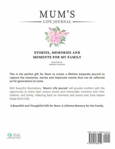 A Kind and Thoughtful Gift for Mum. A Lifetime Memory for The Family. This is Mum's opportunity to share her life story in her very own guided journal that can be kept as a forever keepsake for generations to come. Learn all about Mum's life from childhood, teenage years, adulthood and parenting by allowing her to share those special stories and memorable moments. 'Mum's Life Journal' includes: - Over 100 guided questions to help bring together the special memories and stories that may never have been asked or shared before. - Full-color interior and illustrations making it unique to other publications that are printed in B&W - Spaces to provide photos, notes, and other special memories or memorabilia - A Family Tree template to add generational information - Paperback edition or SPECIAL Hardback Edition with Gloss Cover at 8.5 x 11 inch. - Plus, much more! 'Mum's Life Journal' is the perfect gift to record all of her memories and stories in this beautifully created guided journal. This could be the once in a lifetime opportunity for Mum to share her life story. Perfect for:A Mother's Day Gift Birthday Gift Christmas Gift Scroll up and purchase Mum's lifetime memory journal TODAY.