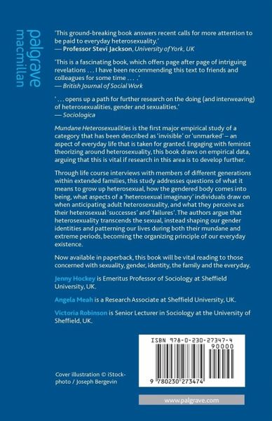 'This ground-breaking book answers recent calls for more attention to be paid to everyday heterosexuality. Drawing on interviews with three generations of families the authors illuminate the processes whereby heterosexuality is both reproduced and changed intra-generationally and inter-generationally and show how heterosexuality orders far more than merely our sexual lives. In so doing they cast new light on what is still too often treated as an 'unmarked' category.' - Professor Stevi Jackson, University of York, UK