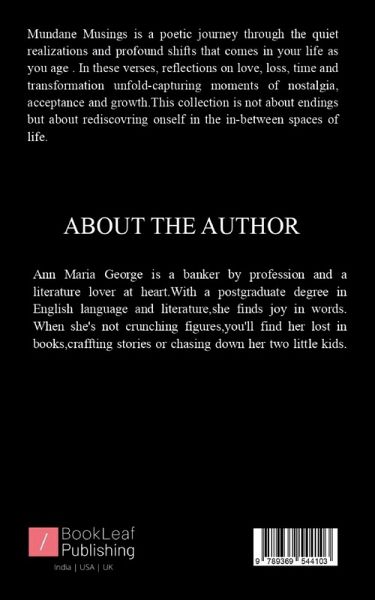 Mundane musings isa poetic journey through the quiet realizations and profound shifts that comes with age.In these verses,reflections on love,loss,time and transformation unfold- capturing moments of nostalgia,acceptance and growth.This collection is not about endings but about rediscovering oneself in the in-between spaces of life.