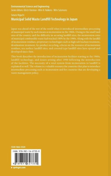 Japan was ahead of the rest of the world when it introduced intermediate processing of municipal waste by such means as incineration in the 1960s. Owing to the small land area of the country and the difficulty in securing landfill sites, the incineration ratio of municipal combustible waste had reached 100% by the 1990s. Along with the landfill of incineration residues, proprietary technologies such as high salt leachate treatment, desalination treatment, by-product recycling, a focus on the resource of incineration residues, sea surface landfill sites, and covered type landfill sites have…mehr