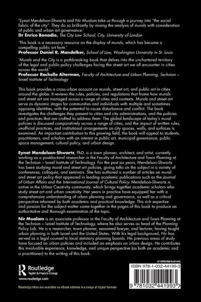 Eynat Mendelson-Shwartz, PhD, is a town planner, architect, and artist, currently working as a postdoctoral researcher in the Faculty of Architecture and Town Planning at the Technion - Israel Institute of Technology. For the past six years, Mendelson-Shwartz has been studying mural and street art policies, giving talks on the subject in a variety of conferences, colloquia, and seminars. She has authored a number of articles on mural and street art policy that appeared in leading academic publications such as the Journal of Urban Affairs and the International Journal of Cultural Policy. Mendelson-Shwartz is active in the Urban Creativity community, which brings together academic scholars who study street art and urban creativity. Her years in practice have equipped her with a comprehensive understanding of urban planning and governance, as well as a critical perspective informed by both academic and practical knowledge. This rich expertise and passion for the subject matter come together in the pages of this book to produce an authoritative and thorough examination of the topic. Nir Mualam is an associate professor in the Faculty of Architecture and Town Planning at the Technion - Israel Institute of Technology, where he also serves as head of the Planning Policy Lab. He is a researcher, town planner, seasoned lawyer, and lecturer, having taught urban planning in both Israel and the United States. With his legal background, Nir has served as a legal counsel to local statutory planning boards. His previous areas of study have focused on urban policies and included an emphasis on urban design. He contributes this invaluable experience, knowledge, and unique perspective (as both an academic and a practitioner) to the writing of this book.