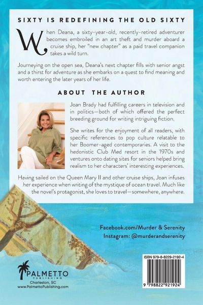 Delve into the uncharted course of being a mature older woman on the open sea with Deana, a sixty-year-old, recently-retired adventurer whose new role as a paid travel companion embroils her in an art theft and murder aboard a cruise ship. Like many women entering the second half of their life, Deana's journey has been marked with personal pain-sexual abuse, workplace harassment, and marital infidelity. Now newly retired, newly single, and wholly ready to start living her life, she's finally able to pursue a lifelong passion: traveling the world. However, no degree of client screening could prepare Deana for the deadly challenges she encounters on a cruise to Curaçao. Soon, someone on board turns up dead amid efforts to reclaim a valuable, once-thought-missing Vincent Van Gogh painting. Now, Deana wades through dangerous territory that brings into focus the rite of passage for the mature single woman as she tries to find the truth and right a wrong. Deana embarks on the cruise for a new start but ends up on a quest to find meaning and worth as she enters the later years of her life. Murder & Serenity shows that women of any age have a capacity for empowerment. Female Boomer generation readers will revel in references to '70s and '80s pop culture-as well as horror stories about online dating in your fifties and sixties. Joan's witty and wry sense of humor complements this otherwise intense story of family loyalty, deceit, and murder.