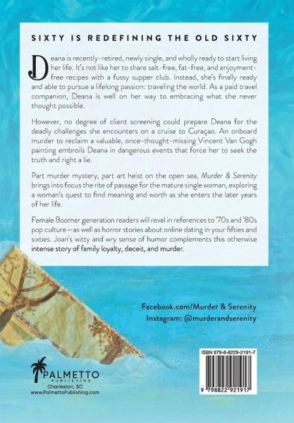 Delve into the uncharted course of being a mature older woman on the open sea with Deana, a sixty-year-old, recently-retired adventurer whose new role as a paid travel companion embroils her in an art theft and murder aboard a cruise ship. Like many women entering the second half of their life, Deana's journey has been marked with personal pain-sexual abuse, workplace harassment, and marital infidelity. Now newly retired, newly single, and wholly ready to start living her life, she's finally able to pursue a lifelong passion: traveling the world. However, no degree of client screening could prepare Deana for the deadly challenges she encounters on a cruise to Curaçao. Soon, someone on board turns up dead amid efforts to reclaim a valuable, once-thought-missing Vincent Van Gogh painting. Now, Deana wades through dangerous territory that brings into focus the rite of passage for the mature single woman as she tries to find the truth and right a wrong. Deana embarks on the cruise for a new start but ends up on a quest to find meaning and worth as she enters the later years of her life. Murder & Serenity shows that women of any age have a capacity for empowerment. Female Boomer generation readers will revel in references to '70s and '80s pop culture-as well as horror stories about online dating in your fifties and sixties. Joan's witty and wry sense of humor complements this otherwise intense story of family loyalty, deceit, and murder.