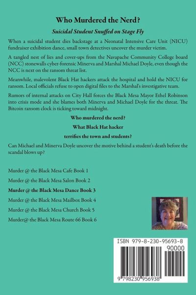 Who Murdered the Nerd? Suicidal Student Snuffed on Stage Fly When a suicidal student dies backstage at a Neonatal Intensive Care Unit (NICU) fundraiser exhibition dance, small town detectives uncover the murder victim. A tangled nest of lies and cover-ups from the Navapache Community College board (NCC) stonewalls cyber-forensic Minerva and Marshal Michael Doyle, even though the NCC is next on the ransom threat list. Meanwhile, malevolent Black Hat hackers attack the hospital and hold the NICU for ransom. Local officials refuse to open digital files to the Marshal's investigative team. Rumors of internal attacks on City Hall forces the Black Mesa Mayor Ethel Robinson into crisis mode and she blames both Minerva and Michael Doyle for the threat. Who murdered the nerd? What Black Hat hacker terrifies the town and students? The Bitcoin ransom clock is ticking toward midnight. Can Michael and Minerva Doyle uncover the motive behind a student's death before the scandal blows up?
