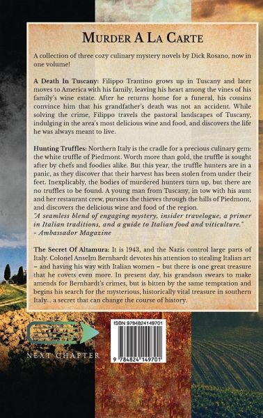 A collection of three cozy culinary mystery novels by Dick Rosano, now in one volume! A Death In Tuscany: Filippo Trantino grows up in Tuscany and later moves to America with his family, leaving his heart among the vines of his family's wine estate. After he returns home for a funeral, his cousins convince him that his grandfather's death was not an accident. While solving the crime, Filippo travels the pastoral landscapes of Tuscany, indulging in the area's most delicious wine and food, and discovers the life he was always meant to live. Hunting Truffles: Northern Italy is the cradle for a precious culinary gem: the white truffle of Piedmont. Worth more than gold, the truffle is sought after by chefs and foodies alike. But this year, the truffle hunters are in a panic, as they discover that their harvest has been stolen from under their feet. Inexplicably, the bodies of murdered hunters turn up, but there are no truffles to be found. A young man from Tuscany, in tow with his aunt and her restaurant crew, pursues the thieves through the hills of Piedmont, and discovers the delicious wine and food of the region. "A seamless blend of engaging mystery, insider travelogue, a primer in Italian traditions, and a guide to Italian food and viticulture." - Ambassador Magazine The Secret Of Altamura: It is 1943, and the Nazis control large parts of Italy. Colonel Anselm Bernhardt devotes his attention to stealing Italian art - and having his way with Italian women - but there is one great treasure that he covets even more. In present day, his grandson swears to make amends for Bernhardt's crimes, but is bitten by the same temptation and begins his search for the mysterious, historically vital treasure in southern Italy... a secret that can change the course of history.
