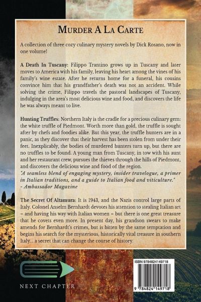 A collection of three cozy culinary mystery novels by Dick Rosano, now in one volume! A Death In Tuscany: Filippo Trantino grows up in Tuscany and later moves to America with his family, leaving his heart among the vines of his family's wine estate. After he returns home for a funeral, his cousins convince him that his grandfather's death was not an accident. While solving the crime, Filippo travels the pastoral landscapes of Tuscany, indulging in the area's most delicious wine and food, and discovers the life he was always meant to live. Hunting Truffles: Northern Italy is the cradle for a precious culinary gem: the white truffle of Piedmont. Worth more than gold, the truffle is sought after by chefs and foodies alike. But this year, the truffle hunters are in a panic, as they discover that their harvest has been stolen from under their feet. Inexplicably, the bodies of murdered hunters turn up, but there are no truffles to be found. A young man from Tuscany, in tow with his aunt and her restaurant crew, pursues the thieves through the hills of Piedmont, and discovers the delicious wine and food of the region. "A seamless blend of engaging mystery, insider travelogue, a primer in Italian traditions, and a guide to Italian food and viticulture." - Ambassador Magazine The Secret Of Altamura: It is 1943, and the Nazis control large parts of Italy. Colonel Anselm Bernhardt devotes his attention to stealing Italian art - and having his way with Italian women - but there is one great treasure that he covets even more. In present day, his grandson swears to make amends for Bernhardt's crimes, but is bitten by the same temptation and begins his search for the mysterious, historically vital treasure in southern Italy... a secret that can change the course of history.