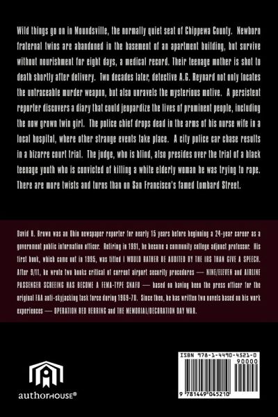 Wild things go on in Moundsville, the normally quiet seat of Chippewa County. Newborn fraternal twins are abandoned in the basement of an apartment building, but survive without nourishment for eight days, a medical record. Their teenage mother is shot to death shortly after delivery. Two decades later, detective A.G. Reynard not only locates the untraceable murder weapon, but also unravels the mysterious motive. A persistent reporter discovers a diary that could jeopardize the lives of promiment people, including the now grown twin girl. The police chief drops dead in the arms of his nurse wife in a local hospital, where other strange events take place. A city police car chase results in a bizarre court trial. The judge, who is blind, also presides over the trial of a black teenage youth who is convicted of killing a white elderly woman he was trying to rape. There are more twists and turns than on San Francisco's famed Lombard Street.