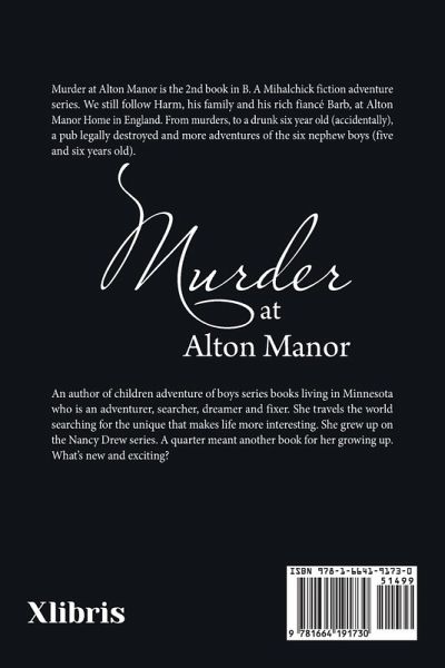 Murder at Alton Manor is the 2nd book in B. A Mihalchick fiction adventure series. We still follow Harm, his family and his rich fiancé Barb, at Alton Manor Home in England. From murders, to a drunk six year old (accidentally), a pub legally destroyed and more adventures of the six nephew boys (five and six years old).
