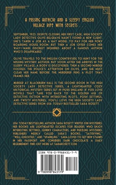 A missing author and a sleepy English village rife with secrets . . . September, 1923. Despite closing her first case, high society lady detective Olive Belgrave hasn’t found a new client. She’s taken a job as a hat model to pay for her poky boarding house room. But then a job offer comes her way—make discreet inquiries about a famous author who’s disappeared. Olive travels to the English countryside to hunt for the missing mystery author. But soon after she arrives in the sleepy village, a body is discovered. Then a second murder focuses the police’s attention on Olive, and she must clear her name before the murderer pens a plot that frames her. Murder at Blackburn Hall is the second book in the High Society Lady Detective series, a lighthearted cozy historical mystery series set in 1920s England. If you love novels that take you back to the Golden Age of detective fiction with interesting plots, posh settings, and twisty mysteries, you’ll love the High Society Lady Detective Series from USA Today bestseller Sara Rosett.
