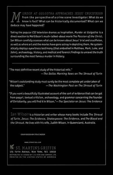 "Intriguing and thought-provoking, Murder at Golgotha amounts to a latter-day Cold Case episode on a centuries-old event that has changed the lives of millions throughout the world." ---Booklist "The most definitive recent study of the historical relic." ---The Dallas Morning News on The Shroud of Turin "Wilson's outstanding study must surely be the most complete yet undertaken of the subject." ---Washington Post on The Shroud of Turin "If you want a beautifully illustrated account of the sort of evidence that can be got from papyri, textual criticism, archaeology, and grammar concerning the founder of Christianity, you will find it in Wilson." ---The Spectator on Jesus: The Evidence Murder at Golgotha approaches Jesus' crucifixion from the perspective of a crime scene investigator: What do we know is fact? What can be historically documented? What can we deduce may have happened? Taking the popular CSI television dramas as inspiration, Murder at Golgotha is a direct reaction to Mel Gibson's much talked about movie The Passion of the Christ. Ian Wilson carefully assesses what can be known about Jesus' trial and crucifixion, as well as where art and the movies have gone astray in depicting them. He systemically deploys eyewitness testimony (that embodied in Matthew, Mark, Luke, and John), archaeology, history, and medical and forensic findings to unravel the truth surrounding the most famous murder in history. Ian Wilson is a historian and writer whose many books include The Shroud of Turin, Jesus: The Evidence, Shakespeare: The Evidence, and The Blood and the Shroud. He lives with his wife, Judith Wilson, in Queensland, Australia.