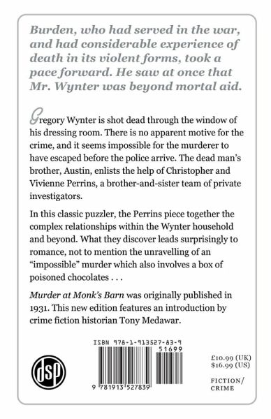 Burden, who had served in the war, and had considerable experience of death in its violent forms, took a pace forward. He saw at once that Mr. Wynter was beyond mortal aid. Gregory Wynter is shot dead through the window of his dressing room. There is no apparent motive for the crime, and it seems impossible for the murderer to have escaped before the police arrive. The dead man's brother, Austin, enlists the help of Christopher and Vivienne Perrins, a brother-and-sister team of private investigators. In this classic puzzler, the Perrins piece together the complex relationships within the Wynter household and beyond. What they discover leads surprisingly to romance, not to mention the unravelling of an "impossible" murder which also involves a box of poisoned chocolates . . . Murder at Monk's Barn was originally published in 1931. This new edition features an introduction by crime fiction historian Tony Medawar.