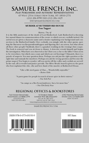 Mystery / Characters: 5 male, 6 female It is the fifth anniversary of the death of Lord Rutherford. Lady Rutherford is throwing her annual dinner in commemoration of the event-- to which you are cordially invited. On arrival you are given a character name and a dossier explaining your background and connection to the Rutherford family. Over cocktails, you mingle with the other guests, spotting the Baroness von Keepsemfrumfloppen and figuring she's an actress, but what about all these other peo