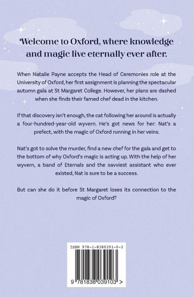 Welcome to Oxford, where knowledge and magic live eternally ever afterWhen Natalie Payne accepts the Head of Ceremonies role at the University of Oxford, her first assignment is planning the spectacular autumn gala at St Margaret College. However, her plans are dashed when she finds their famed chef dead in the kitchen.If that discovery isn't enough, the cat following her around is actually a four-hundred-year-old wyvern. He's got news for her: Nat's a prefect, with the magic of Oxford running in her veins.Nat's got to solve the murder, find a new chef for the gala and get to the bottom of why Oxford's magic is acting up. With the help of her wyvern, a band of Eternals and the savviest assistant who ever existed, Nat is sure to be a success.But can she do it before St Margaret loses its connection to the magic of Oxford?