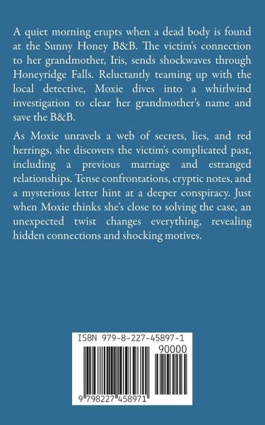A quiet morning erupts when a dead body is found at the Sunny Honey B&B. The victim's connection to her grandmother, Iris, sends shockwaves through Honeyridge Falls. Reluctantly teaming up with the local detective, Moxie dives into a whirlwind investigation to clear her grandmother's name and save the B&B. As Moxie unravels a web of secrets, lies, and red herrings, she discovers the victim's complicated past, including a previous marriage and estranged relationships. Tense confrontations, cryptic notes, and a mysterious letter hint at a deeper conspiracy. Just when Moxie thinks she's close to solving the case, an unexpected twist changes everything, revealing hidden connections and shocking motives.