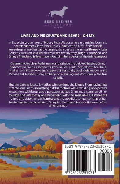 LIARS AND PIE CRUSTS AND BEARS – OH MY! In the picturesque town of Moose Peak, Alaska, where mountains loom and secrets simmer, Ginny Jones–that's Jomes with an "M"–finds herself knee-deep in another captivating mystery. Just as the annual Bearpaw Lake Berryfest kicks off, disaster strikes when the mystery judge is poisoned, and Ginny's friend and fellow maven Ruth Smithers becomes the prime suspect. Determined to clear Ruth's name and salvage the beloved festival, Ginny embraces her role as the town's silver-haired sleuth. Armed with her sharp intellect and the unwavering support of her quirky book club known as the Moose Peak Mavens, Ginny embarks on a thrilling quest to unmask the true culprit. But the path to justice is riddled with perilous challenges. From navigating treacherous lies to unearthing hidden motives while avoiding unexpected encounters with bears and a persistent stalker, Ginny must summon all her courage and wits to stay one step ahead. With the invaluable assistance of a retired and debonair U.S. Marshal and the steadfast companionship of her trusted miniature dachshund, Ginny is determined to crack the case before time runs out.