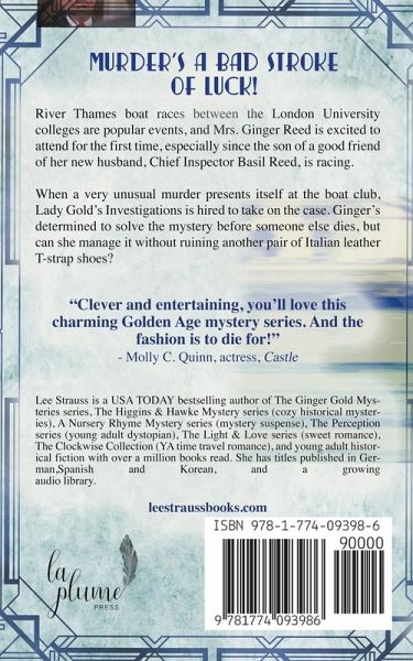 "Clever and entertaining, you'll love this charming Golden Age mystery series. And the fashion is to die for!" - Molly C. Quinn, actress, Castle Murder's a Bad Stroke of Luck! River Thames boat races between the London University colleges are popular events, and in the spring of 1925 Mrs. Ginger Reed is excited to attend for the first time, especially since the son of a good friend of her new husband, Chief Inspector Basil Reed, is racing. When a very unusual murder presents itself at the boat club, Lady Gold's Investigations is hired to take on the case. Ginger's determined to solve the mystery before someone else dies, but can she manage it without ruining another pair of Italian leather T-strap shoes? ¿¿¿¿¿ Researching for the Ginger Gold Mysteries has been so much fun. I hope you sense that as you read. Ginger Gold is smart, savvy, and delightful. The fashions, the dances, the CRIME. The character of Haley Higgins, a medical student at the London Medical School for Women allows me to further delve into another keen interest of mine: forensics. Never fear, the Ginger Gold Mysteries are COZY, so no scary, graphic on-stage violence. You'll find these books to be clean reads, with no swearing or sex. I hope you enjoy the Ginger Gold Mystery series! Hop aboard the 1920s! THE GINGER GOLD MYSTERY SERIES Murder on the SS Rosa (Book 1) Murder at Hartigan House (Book 2) Murder at Bray Manor (Book 3) Murder at Feathers & Flair (Book 4) Murder at the Mortuary (Book 5) Murder at Kensington Gardens (Book 6) Murder at st. George's Church (Book 7) The Wedding of Ginger & Basil (Book 7.5) Murder Aboard the Flying Scotsman (Book 8) Murder at the Boat Club (Book 9) Murder on Eaton Square (Book 10) Murder by Plum Pudding (Book 11) Murder on Fleet Street (Book 12) Murder at Brighton Beach (Book 13) Murder at Hyde Park (Book 14) Murder at Royal Albert Hall (Book 15) Murder in Belgravia (Book 16) Murder on Mallowan Court (Book 17) Murder at the Savoy (Book 18) Murder at the Circus (Book 19) ~more on the way! A brand new 1950s series!