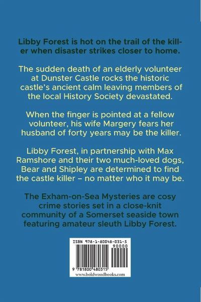 Libby Forest is hot on the trail of the killer when disaster strikes closer to home. The sudden death of an elderly volunteer at Dunster Castle rocks the Castle's ancient calm to its core leaving members of the local History Society devastated. When the finger is pointed at a fellow volunteer, his wife Margery fears her husband of forty years may be the killer. Libby Forest, in partnership with Max Ramshore and their two much-loved dogs, Bear and Shipley are determined to find the castle killer - no matter who it may be. Quirky characters, dogs, cake and gossip abound in this Exham-on-Sea Murder Mystery, set in a charming English seaside town of Exham-on-Sea - a book for readers who love Agatha Christie-style murder mysteries, cosy crime, dogs, cake and chocolate.