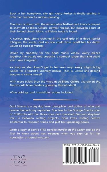 Back in her hometown, city girl Avery Parker is finally settling in after her husband's sudden passing. The town is abuzz with the annual wine festival and Avery is amped to show off Le Blanc Cellars' newest release. But between pours of their famed Chenin Blanc, a lifeless body is found. A curious gray stone clutched in the cold grip of a dead tourist intrigues the locals, and no one expects his death would be ruled a murder. Driven by empathy for the dead man's widow, Avery pieces together the puzzle and unearths a scandal larger than she could ever have imagined. As long as she doesn't get in her own way, Avery might bring justice for a tourist's untimely demise. That is, unless she becomes a victim herself. With more twists than the vines at Le Blanc Cellars, Murder at the Festival will have readers guessing this whodunit. Wine pairings and irresistible recipes included!