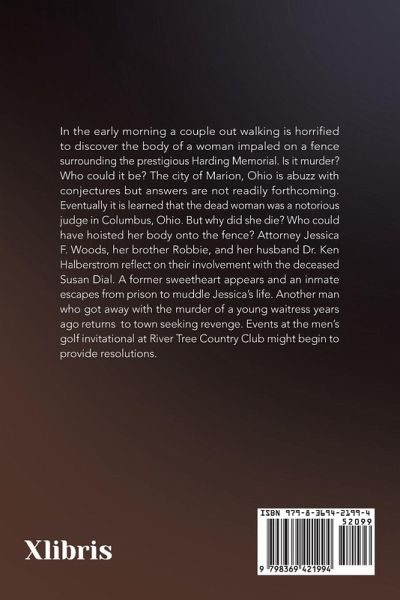 In the early morning a couple out walking is horrified to discover the body of a woman impaled on a fence surrounding the prestigious Harding Memorial. Is it murder? Who could it be? The city of Marion, Ohio is abuzz with conjectures but answers are not readily forthcoming. Eventually it is learned that the dead woman was a notorious judge in Columbus, Ohio. But why did she die? Who could have hoisted her body onto the fence? Attorney Jessica F. Woods, her brother Robbie, and her husband Dr. Ken Halberstrom reflect on their involvement with the deceased Susan Dial. A former sweetheart appears and an inmate escapes from prison to muddle Jessica's life. Another man who got away with the murder of a young waitress years ago returns to town seeking revenge. Events at the men's golf invitational at River Tree Country Club might begin to provide resolutions.