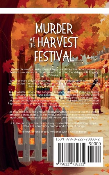 In the charming coastal town of Seagrove Harbor, the annual Harvest Festival is a celebration of community, food, and friendship-until tragedy strikes. When beloved organic grocer, Maria Alvarez, collapses after sampling her famous salsa, the idyllic atmosphere shatters, leaving everyone questioning the innocence of their cherished traditions. Lila McAllister, owner of the Seagrove Bakery & Café, can't shake the feeling that something sinister lurks beneath the surface. Teaming up with Maria's niece, aspiring detective Izzy Alvarez, the duo dives into a web of secrets, jealousy, and dangerous culinary concoctions. With whispers of tampered ingredients and a poisoned salsa recipe, Lila and Izzy must uncover the truth before another life is lost. As they chop, mix, and unravel the mystery, they'll discover that the cost of ambition can be deadly. Will they solve the mystery before the killer strikes again, or will the heart of Seagrove Harbor be forever tainted by tragedy? Join Lila and Izzy in this cozy culinary mystery filled with delicious recipes, close-knit community drama, and a dash of danger. Perfect for fans of cozy mysteries with a twist of flavor!