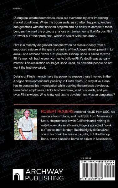 During real estate boom times, risks are overcome by ever improving market conditions. When the boom ends, as so often happens, lenders can get stuck with half finished projects and no ability to complete them. Lenders then sell the projects at a loss or hire someone like Marcus Flint to work out their problems, which is easier said than done. Flint is a recently diagnosed diabetic when he dies suddenly from a supposed seizure at the grand opening of the Apogee development in La Jollaone of those work out projects. Bishop Bone is asked to write Flints memoir, but he soon comes to believe Flints death was actually murder. This realization could get Bone killed, as powerful people do not want the truth revealed. Details of Flints memoir have the power to expose those involved in the Apogee development and, possibly, in Flints death. To stay alive, Bone has to continue his investigation while ducking the projects developer, terminated employees, Flints brother-in-law, jilted husbands, and yes, even Flints widow. Who knew real estate development was so dangerous?