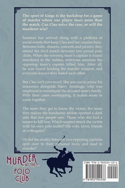 The sport of kings is the backdrop for a game of murder where one player loses more than the match. Can Cleo solve the case, or will the murderer win? Summer has arrived along with a plethora of social events that keep Cleo and her cousins busy. Between balls, dinners, concerts and picnics, they attend the final match between two proud polo clubs. When the winning team's captain is found murdered in the stables, everyone assumes the opposing team's captain killed him. After all, he was found holding the murder weapon, and everyone knows they hated each other. But Cleo isn't convinced. She sets out to prove his innocence alongside Harry Armitage, who was employed to investigate the accused man's family. With their cases overlapping, it makes sense to work together. The more they get to know the victim, the more they realize the handsome athlete sported a dark side that few people saw. Those who did had a reason to kill him. Which suspect struck the victim with his own polo mallet? His wife, lover, friends or colleagues? Or did the rivalry between two opposing captains spill over to their personal lives, and lead to murder?