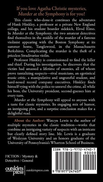 Set in the idyllic Tanglewood, the real-life summer home of the Boston Symphony, Murder at the Symphony is a classic who-done-it in the vein of Agatha Christie. The book continues the adventures of Hank Hinkley, a professor at a private New England college and his student boarder sidekick, Elrod Elmo. In this adventure, the two detectives find themselves in the middle of the murder of a famous violinist appearing with the symphony. Complicating the murder is the theft of maestro's Stradivarius violin. Visiting the Berkshires for a weekend of concerts, Hinkley is commissioned to find the killer and thief. In the process of his investigation, he discovers that the victim had amassed a lifetime of enemies, all of whom prove tantalizing suspects. These suspects include rival musicians, an egotistical music critic, a manipulative and ungrateful student, and hard-nosed record company executives. He finds himself vying with the police to unravel the crime. Meanwhile, his boss, the University President, is second-guessing him all the way. The book will appeal to anyone with a taste for classic mysteries. Its engaging mix of humor, an intriguing plot, and a surprise conclusion will delight any mystery reader. Watcyn Lewis is the author of several of the Professor Hank Hinkley mysteries. He holds a Bachelor of Arts from Wesleyan University and an MBA with Honors from the University of Pennsylvania's Wharton School of Business. He lives in Connecticut.