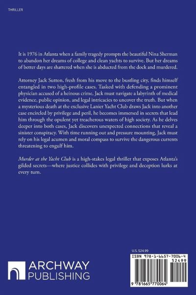 It is 1976 in Atlanta when a family tragedy prompts the beautiful Nina Sherman to abandon her dreams of college and clean yachts to survive. But her dreams of better days are shattered when she is abducted from the dock and murdered. Attorney Jack Sutton, fresh from his move to the bustling city, finds himself entangled in two high-profile cases. Tasked with defending a prominent physician accused of a heinous crime, Jack must navigate a labyrinth of medical evidence, public opinion, and legal intricacies to uncover the truth. But when a mysterious death at the exclusive Lanier Yacht Club draws Jack into another case encircled by privilege and peril, he becomes immersed in secrets that lead him through the opulent yet treacherous waters of high society. As he delves deeper into both cases, Jack discovers unexpected connections that reveal a sinister conspiracy. With time running out and pressure mounting, Jack must rely on his legal acumen and moral compass to survive the dangerous currents threatening to engulf him. Murder at the Yacht Club is a high-stakes legal thriller that exposes Atlanta's gilded secrets-where justice collides with privilege and deception lurks at every turn.
