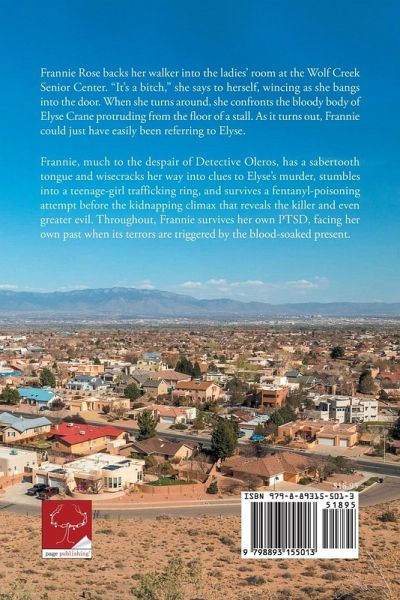 Frannie Rose backs her walker into the ladies' room at the Wolf Creek Senior Center. "It's a bitch," she says to herself, wincing as she bangs into the door. When she turns around, she confronts the bloody body of Elyse Crane protruding from the floor of a stall. As it turns out, Frannie could just have easily been referring to Elyse. Frannie, much to the despair of Detective Oleros, has a sabertooth tongue and wisecracks her way into clues to Elyse's murder, stumbles into a teenage-girl trafficking ring, and survives a fentanyl-poisoning attempt before the kidnapping climax that reveals the killer and even greater evil. Throughout, Frannie survives her own PTSD, facing her own past when its terrors are triggered by the blood-soaked present.
