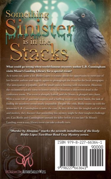 What could go wrong when world-famous mystery author L.B. Cunningham visits Moon's Landing Library for a special event? As it turns out, quite a lot. Birdie Lopez is ecstatic about the opportunity to meet one of her favorite authors and eagerly agrees to photograph the event for the local newspaper. The anticipation is palpable, and the small town is buzzing with excitement. However, the excitement quickly turns to horror when the librarian is discovered dead in the conference room. The event is abruptly halted, and the library is plunged into chaos. With a room full of potential suspects and a baffling mystery on their hands, the task of finding the murderer seems nearly impossible. Despite the odds, Birdie teams up with the renowned L.B. Cunningham to solve the case. As they delve into the tangled web of clues and motives, they discover that unraveling this mystery might be their toughest challenge yet. Can Birdie and Cunningham unmask the killer before it's too late? In Moon's Landing, even a cozy library event can take a deadly turn. Murder by Almanac is a novella and #7 in the Moon's Landing cozy mystery series.