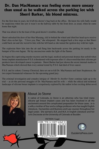 This captivating murder mystery depicts the exposure of a breast implant manufacturer whose products have caused the development of cancer in patients. As she is leaving her lover/client/friend Dr. Dan MacNamara , Sherri Barker, a detail person for PolySurgical Specialties, a manufacturer of polyurethane coated breast implants, is killed by a car bomb. Dr. MacNamara happens to be the plastic surgeon who inserted PSS breast implants into Pamela Lawson, who is awaiting a liver transplant for liver cancer. Her attorney, Janet Stephenson, has filed a product's liability suit against PSS and Dr. MacNamara is a key witness for PSS. Ms Barker, however, had just delivered to him secret internal studies which showed that all animals tested by PSS developed liver cancer. PSS and its cohort, Conway Chemical, have set out to kill Dr. MacNamara, and Janet Stephenson's two expert witnesses, biomaterials scientists from Canada. Meanwhile, a television network reporter and an FDA investigator are preparing a special on the PSS implants, which airs just before the Lawson v. PSS trial. The investigation and intrigue related to the murder continue right up to the Lawson v. PSS trial, and coordinate with the criminal investigation and grand jury indictment of the principals at PSS and Conway and their murderous lackeys. A native of Colorado, Jo Stone is an attorney who has tried many silicone gel breast implant cases and has been involved in all of the excitement surrounding the complicated preparation and trial of those cases. This wife and mother of four is also a college professor who has taught English literature, Humanities, Business and Law courses throughout her legal career Jo attended the University of Colorado at Boulder where she earned my B.A. and M.A. in English literature and Juris Doctorate degrees.