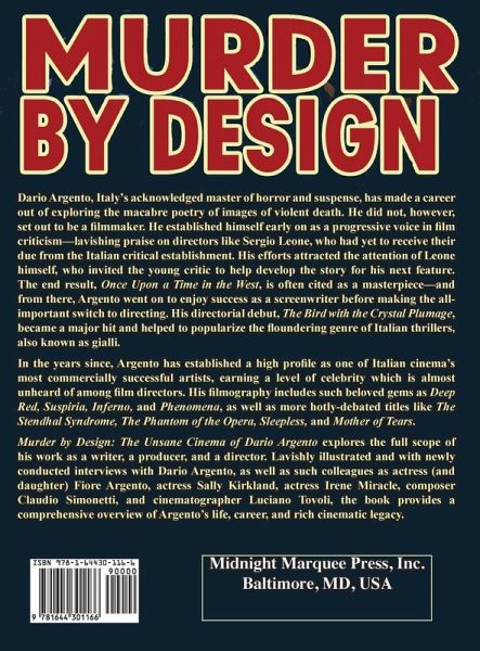 An in-depth look at the films of Dario Argento, Italy's acknowledged master of horror and suspense, has made a career out of exploring the macabre poetry of images of violent death. He did not, however, set out to be a filmmaker. He established himself early on as a progressive voice in film criticism-lavishing praise on directors like Sergio Leone, who had yet to receive their due from the Italian critical establishment. His efforts attracted the attention of Leone himself, who invited the young critic to help develop the story for his next feature. The end result, Once Upon a Time in the West, is often cited as a masterpiece-and from there, Argento went on to enjoy success as a screenwriter before making the all-important switch to directing. His directorial debut, The Bird with the Crystal Plumage, became a major hit and helped to popularize the floundering genre of Italian thrillers, also known as gialli. In the years since, Argento has established a high profile as one of Italian cinema's most commercially successful artists, earning a level of celebrity which is almost unheard of among film directors. His filmography includes such beloved gems as Deep Red, Suspiria, Inferno, and Phenomena, as well as more hotly-debated titles like The Stendhal Syndrome, The Phantom of the Opera, Sleepless, and Mother of Tears. Murder by Design: The Unsane Cinema of Dario Argento explores the full scope of his work as a writer, a producer, and a director. Lavishly illustrated and with newly conducted interviews with Dario Argento, as well as such colleagues as actress (and daughter) Fiore Argento, actress Sally Kirkland, actress Irene Miracle, composer Claudio Simonetti, and cinematographer Luciano Tovoli, the book provides a comprehensive overview of Argento's life, career, and rich cinematic legacy.