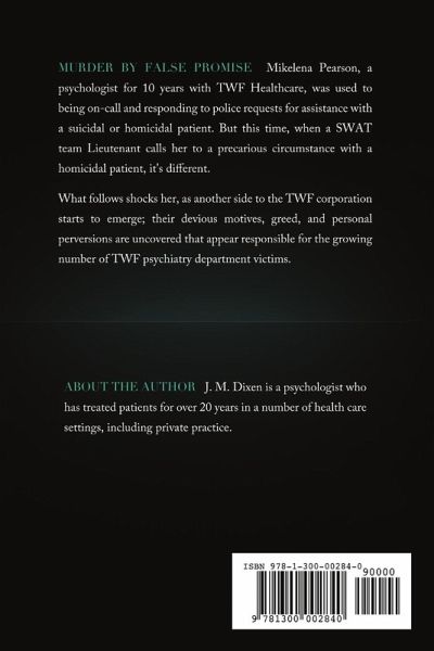 Mikelena Pearson, a psychologist for 10 years with TWF Healthcare, was used to being on-call and responding to police requests for assistance with a suicidal or homicidal patient. But this time, when a SWAT team Lieutenant calls her to a precarious circumstance with a homicidal patient, it's different. What follows shocks her, as another side to the TWF corporation starts to emerge; their devious motives, greed, and personal perversions are uncovered that appear responsible for the growing number of TWF psychiatry department victims.