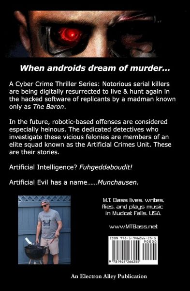 A Cyber Crime Thriller Series: Notorious serial killers digitally resurrected to live & hunt again in hacked replicants, pursued by detectives of the Artificial Crimes Unit. "M.T. Bass kept me on edge the entire way. I can't compare it to anything else."- Frank Frission Reviews After Jake shoots and kills a murder suspect who turns out to be the son of a powerful city councilman, he finds himself demoted to the Artificial Crimes Unit, tracking down androids hacked and programmed to be hitmen. When his case of an "extra-judicial" divorce settlement takes a nasty turn with DNA from a hundred-year-old murder in Boston and a signature that harkens back to the very first serial killer ever in London, Jake finds himself tangled up in the brutal slayings of prostitutes being investigated by his former Robbery/Homicide partner, Maddie-who is now his lover. But a madman, The Baron, is just getting started with his AI recreations of Jack the Ripper's brutal crimes. And Maddie and Jake are teamed up again to stop the carnage as the Baron's army of human replicants imitates history's most notorious serial killers. "It might not make sense, but the beloved Media tags it 'Murder by Munchausen.' For a price, there are hackers out there who will reprogram a synthoid to do your dirty work. The bad news: no fingerprints or DNA left at the crime scene. The good news-at least for us-is that they're like missiles: once they hit their target, they're usually as harmless as empty brass. The trick is to get them before they melt down their core OS data, so you can get the unit into forensics for analysis and, hopefully, an arrest." [excerpt from Murder by Munchausen] Artificial Intelligence? Fuhgeddaboudit! Artificial Evil has a name...Munchausen.