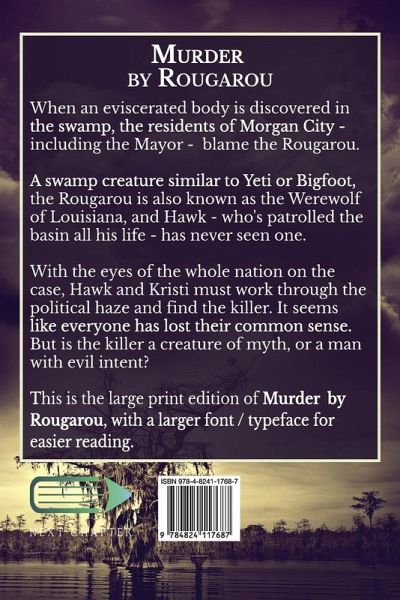 When an eviscerated body is discovered in the swamp, the residents of Morgan City - including the Mayor - blame the Rougarou. A swamp creature similar to Yeti or Bigfoot, the Rougarou is also known as the Werewolf of Louisiana, and Hawk - who's patrolled the basin all his life - has never seen one. With the eyes of the whole nation on the case, Hawk and Kristi must work through the political haze and find the killer. It seems like everyone has lost their common sense. But is the killer a creature of myth, or a man with evil intent? This is the large print edition of Murder by Rougarou, with a larger font / typeface for easier reading.