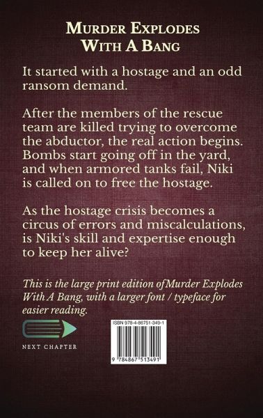 It started with a hostage and an odd ransom demand. After the members of the rescue team are killed trying to overcome the abductor, the real action begins. Bombs start going off in the yard, and when armored tanks fail, Niki is called on to free the hostage. As the hostage crisis becomes a circus of errors and miscalculations, is Niki's skill and expertise enough to keep her alive? This is the large print edition of Murder Explodes With A Bang, with a larger font / typeface for easier reading.