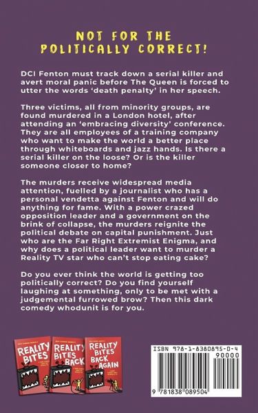 Not for the politically correct! DCI Fenton must track down a serial killer and avert moral panic before The Queen is forced to utter the words 'death penalty' in her speech. Three victims, all from minority groups, are found murdered in a London hotel, after attending an 'embracing diversity' conference. They are all employees of a training company who want to make the world a better place through whiteboards and jazz hands. Is there a serial killer on the loose? Or is the killer someone closer to home? The murders receive widespread media attention, fuelled by a journalist who has a personal vendetta against Fenton and will do anything for fame. With a power crazed opposition leader and a government on the brink of collapse, the murders reignite the political debate on capital punishment. Just who are the Far Right Extremist Enigma, and why does a political leader want to murder a Reality TV star who can't stop eating cake? Do you ever think the world is getting too politically correct? Do you find yourself laughing at something, only to be met with a judgemental furrowed brow? Then this dark comedy whodunit is for you.