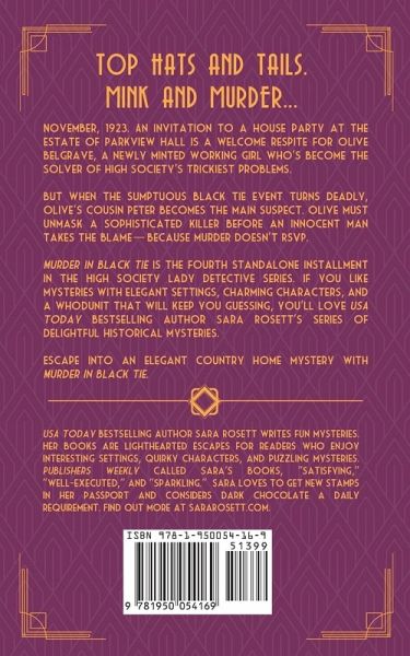 Top hats and tails. Mink and murder . . . November, 1923. An invitation to a house party at the estate of Parkview Hall is a welcome respite for Olive Belgrave, a newly minted working girl who’s become the solver of high society’s trickiest problems. But when the sumptuous black tie event turns deadly, Olive’s cousin Peter becomes the main suspect. Olive must unmask a sophisticated killer before an innocent man takes the blame . . . because murder doesn’t RSVP. Murder in Black Tie is the fourth standalone installment in the High Society Lady Detective series. If you like mysteries with elegant settings, charming characters, and a whodunit that will keep you guessing, you’ll love USA Today bestselling author Sara Rosett’s series of delightful historical mysteries. Escape into an elegant country home mystery with Murder in Black Tie.