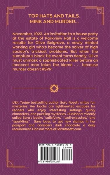 LARGE PRINT EDITION Top hats and tails. Mink and murder . . . November, 1923. An invitation to a house party at the estate of Parkview Hall is a welcome respite for Olive Belgrave, a newly minted working girl who’s become the solver of high society’s trickiest problems. But when the sumptuous black tie event turns deadly, Olive’s cousin Peter becomes the main suspect. Olive must unmask a sophisticated killer before an innocent man takes the blame . . . because murder doesn’t RSVP. Murder in Black Tie is the fourth standalone installment in the High Society Lady Detective series. If you like mysteries with elegant settings, charming characters, and a whodunit that will keep you guessing, you’ll love USA Today bestselling author Sara Rosett’s series of delightful historical mysteries. Escape into an elegant country home mystery with Murder in Black Tie.