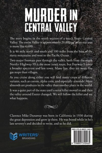 Synopsis: The story begins in the south section of a much larger Central Valley. The entire Valley is approximately 20,000 sq. miles our area is more like 4,600. It is 46 mile north and south and 100 miles from the base of the sierra mountains and west to the Pacific Ocean. Two major freeways pass through the valley, both from the south North> Highway 99 is the most inner route, but Freeway 5 cover a broader spectrum and less town. Many less, they are more like gas stops than villages. As you cruise along either you will find many crops of different variates, such as cotton, alpha corn, and especially almonds' More almonds are produces in the valley than another place in the world. It was a quiet part of the state until a serial killer moved in and then the valley around Exeter changed, We will follow the killer and see what happens. Autobiography: Clarence Mike Dunaway was born in California in 1930 during the great depression and grew ip there. He was bored while in he's late seventy's and decided to write, and so he did.