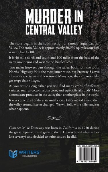 Synopsis: The story begins in the south section of a much larger Central Valley. The entire Valley is approximately 20,000 sq. miles our area is more like 4,600. It is 46 mile north and south and 100 miles from the base of the sierra mountains and west to the Pacific Ocean. Two major freeways pass through the valley, both from the south North> Highway 99 is the most inner route, but Freeway 5 cover a broader spectrum and less town. Many less, they are more like gas stops than villages. As you cruise along either you will find many crops of different variates, such as cotton, alpha corn, and especially almonds' More almonds are produces in the valley than another place in the world. It was a quiet part of the state until a serial killer moved in, and then the valley around Exeter changed. We will follow the killer and see what happens. Autobiography: Clarence Mike Dunaway was born in California in 1930 during the great depression and grew ip there. He was bored while in he's late seventy's and decided to write, and so he did.
