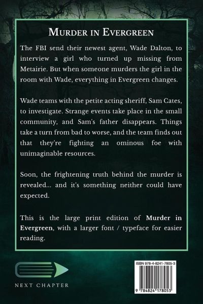 The FBI send their newest agent, Wade Dalton, to interview a girl who turned up missing from Metairie. But when someone murders the girl in the room with Wade, everything in Evergreen changes. Wade teams with the petite acting sheriff, Sam Cates, to investigate. Strange events take place in the small community, and Sam's father disappears. Things take a turn from bad to worse, and the team finds out that they're fighting an ominous foe with unimaginable resources. Soon, the frightening truth behind the murder is revealed... and it's something neither could have expected. This is the large print edition of Murder in Evergreen, with a larger font / typeface for easier reading.