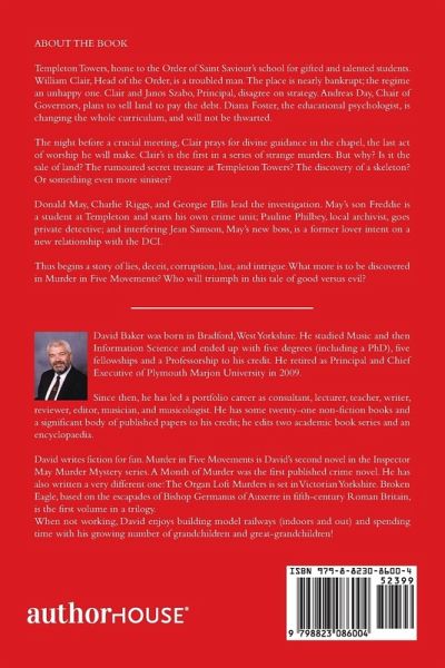 ABOUT THE BOOK Templeton Towers, home to the Order of Saint Saviour's school for gifted and talented students. William Clair, Head of the Order, is a troubled man. The place is nearly bankrupt; the regime an unhappy one. Clair and Janos Szabo, Principal, disagree on strategy. Andreas Day, Chair of Governors, plans to sell land to pay the debt. Diana Foster, the educational psychologist, is changing the whole curriculum, and will not be thwarted. The night before a crucial meeting, Clair prays for divine guidance in the chapel, the last act of worship he will make. Clair's is the first in a series of strange murders. But why? Is it the sale of land? The rumoured secret treasure at Templeton Towers? The discovery of a skeleton? Or something even more sinister? Donald May, Charlie Riggs, and Georgie Ellis lead the investigation. May's son Freddie is a student at Templeton and starts his own crime unit; Pauline Philbey, local archivist, goes private detective; and interfering Jean Samson, May's new boss, is a former lover intent on a new relationship with the DCI. Thus begins a story of lies, deceit, corruption, lust, and intrigue What more is to be discovered in Murder in Five Movements? Who will triumph in this tale of good versus evil?