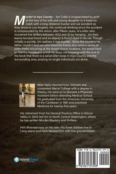 This remarkable and disturbing thriller, Murder in Inyo County, is utterly unforgettable. Between 1932 and 1942, five murders occurred in Inyo County. Each of the murders was identical, hands tied behind their backs, hung upside down, one foot off the floor of the deserted barn each was found in, and their throats were all slit from ear to ear, leaving blood under their heads-all these men, unnamed drifters, passing through the high desert alone. The Sheriff was Merrill Cobb from 1920 to 1956. He never found the murderer and never arrested anyone. Now, fifteen years later, in October 1957, the murderer has returned.On July 4, 1957, the wife and daughter of the newly elected Sheriff of Inyo County, California, Jim Cobb, are instantly killed in a car crash on their way to Los Angeles. Jim Cobb becomes a drunk for the four months since their deaths by way of a leave of absence from his elected duty. A week after the Hanging Murderer returns, the body of Jim's best friend, Barton Haskel, from the Sheriff's Office, is found dead. Jim knows Barton didn't commit suicide. Now, there are two murders to solve.Jim doesn't know it yet, but a man is driving around in a 1940 Chevy truck, killing innocent men and women during his travels.